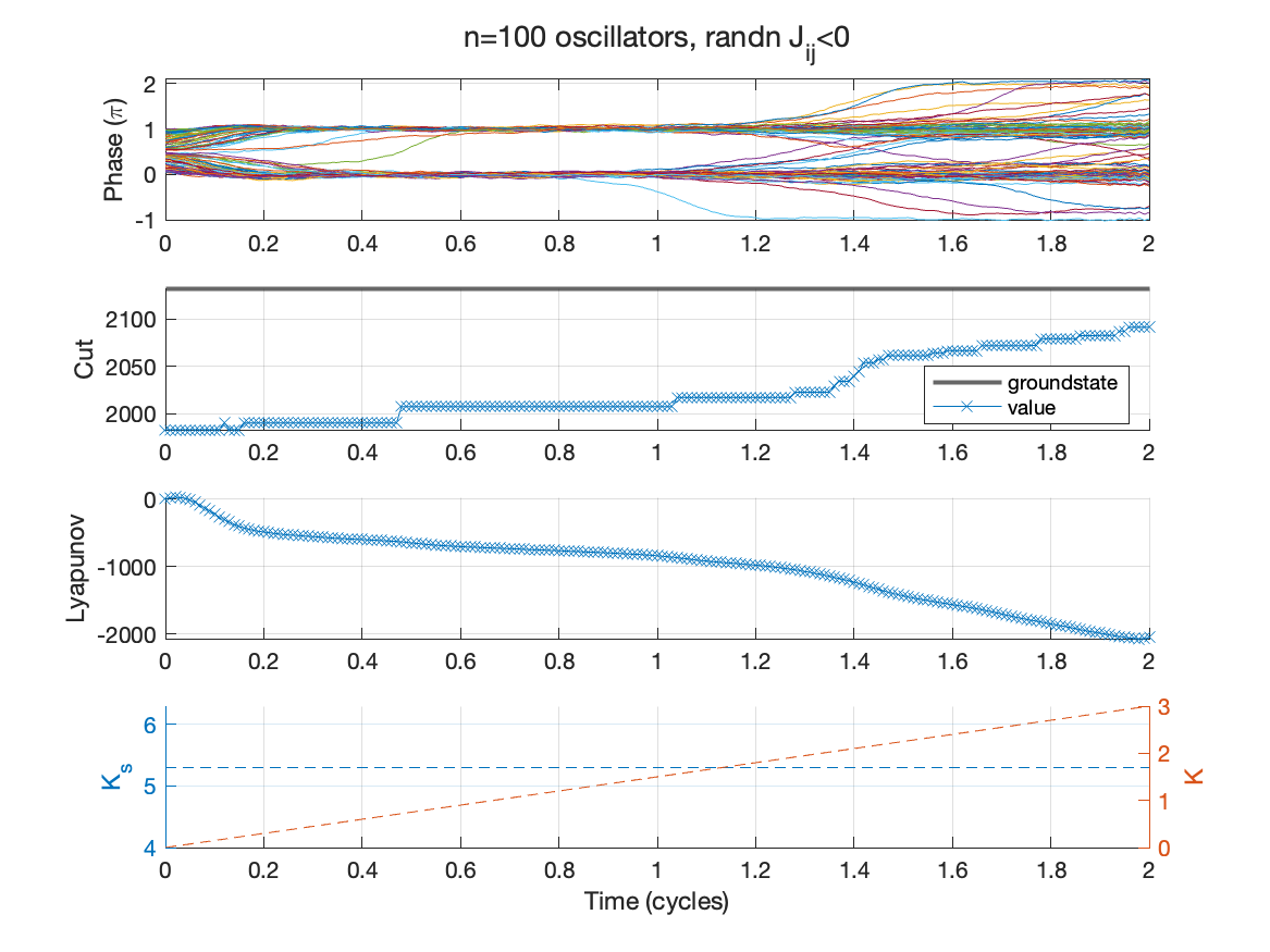 The figure below shows a SDE simulation of the weighted Kuramoto network to solve a 100-variable MaxCut problem. The phase of each oscillator closely aligns to an integer multiple of $\pi$ due to the injection locking (subplot 1). The annealing schedule (subplot 4) ramps an overall gain $K$ and keeps the synchronization gain $K_{s}$ fixed using empirically chosen values. The network almost reaches an optimal phase alignment corresponding to the best cut or groundstate (subplot 2). The Lyapunov function is gradually minimized (subplot 3) even when none of the phases change. This is evident around 0.8 cycles. Note these oscillators generally don’t undergo many phase transitions (bitflips), yet they reliably move the system towards the optimal alignment.