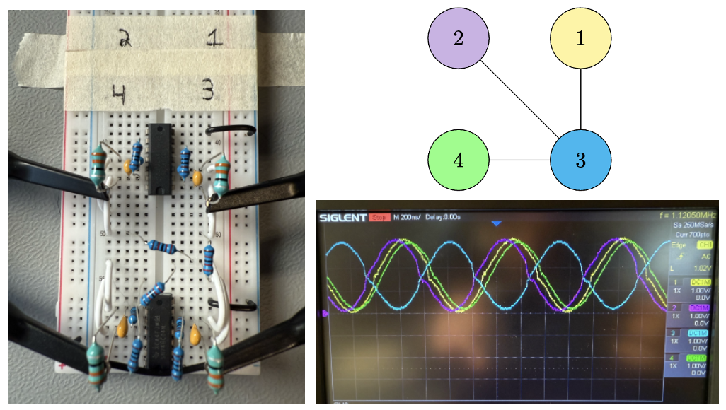 As mentioned, this principle can be demonstrated with a simple breadboard experiment. In this example, 10K ohm resistors connect the variable $x_3$ (blue) to $x_1$ (yellow), $x_2$ (purple), and $x_4$ (green) which themselves share no connections. No injection locking is used for this small experiment. Probes measure the voltage waveform at the inductor at each oscillator. The oscilloscope shows the set of variables ${x_1, x_2, x_4}$ are mis-aligned with ${x_3}$, which indicates the optimal solution $x^{} = [1 1 0 1]$ or equivalently $x^{}=[0 0 1 0]$. In context of the MaxCut problem, this corresponds to “cutting all the resistors” which is the optimal partition for this graph. Although the solution is trivial, it demonstrates how the oscillators can perform the computation “for free”.